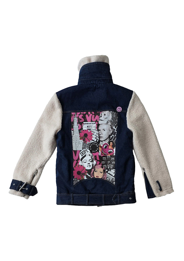 Make a bold statement with the Teddy Denim Moto Jacket. Featuring contrasting tones and plush details, it’s perfect for chilly days with an adventurous edge. Artwork by Love Tara